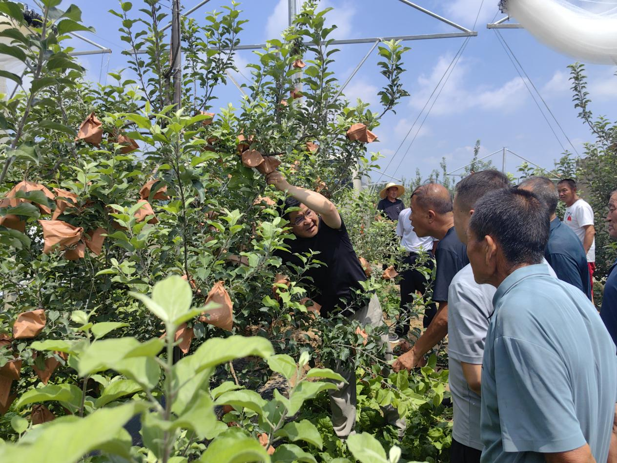 党校组织中国农科院果树所与当地专家在苹果种植基地开展现场教学,讲解果树种植技术和修剪手法。