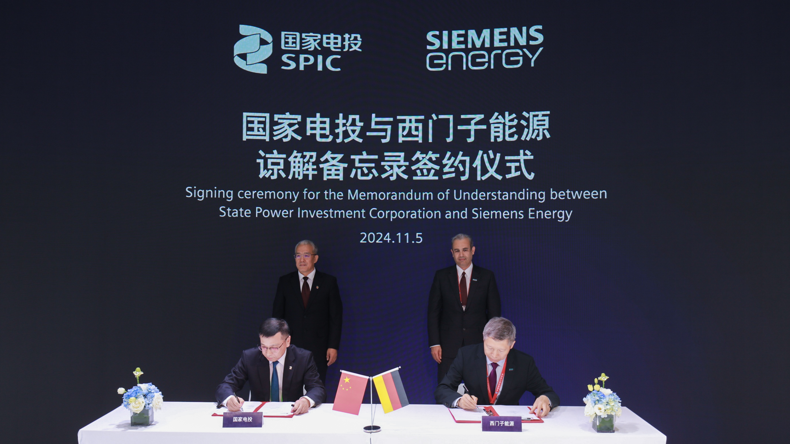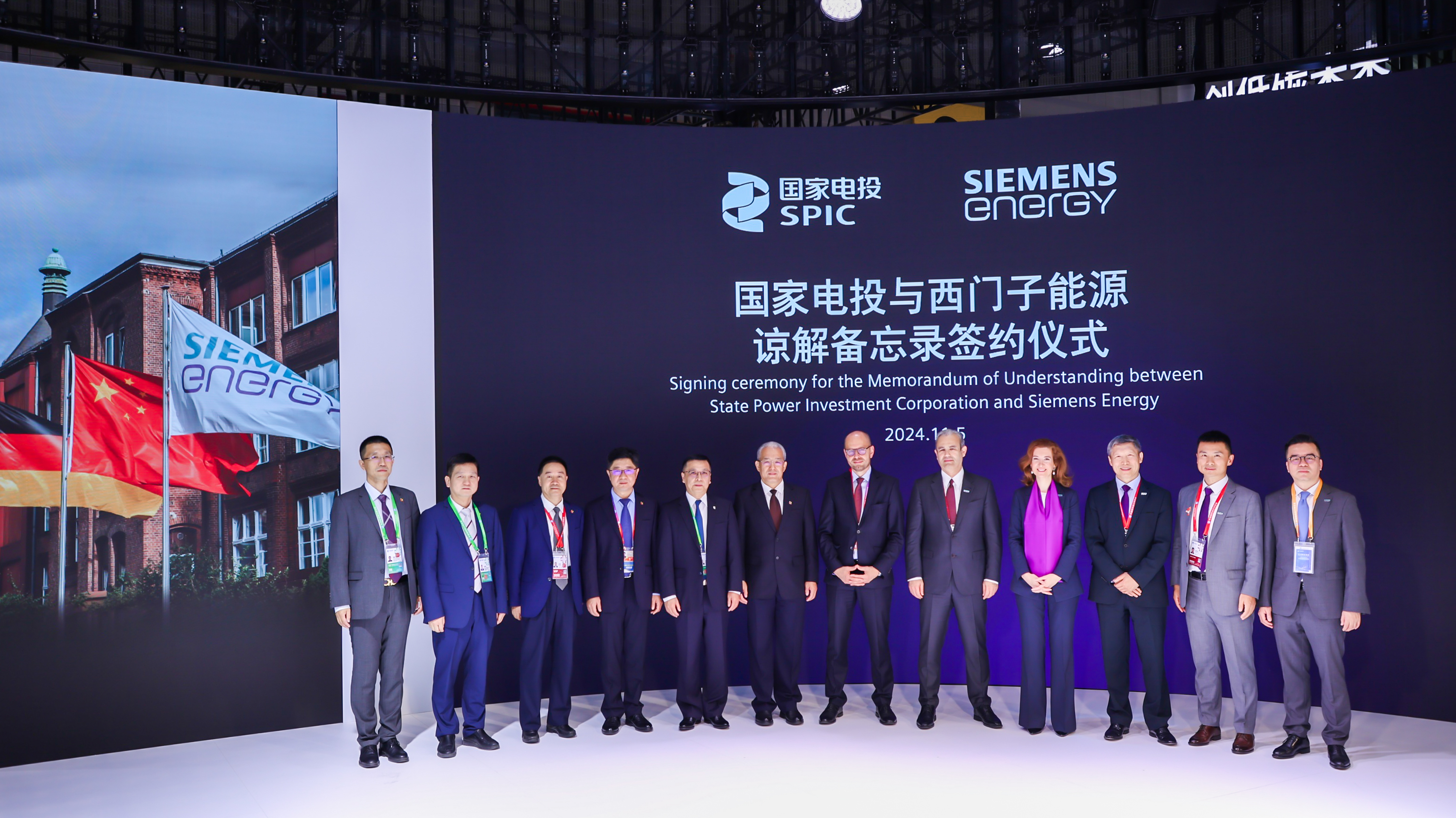 11月5日,国家电投与西门子能源在国家会展中心(上海)举行谅解备忘录签约仪式。国家电投董事、总经理栗宝卿,西门子能源总裁兼首席执行官克里斯蒂安·布鲁赫、执行委员会成员卡瑞姆·阿明出席签约仪式。国家电投副总经济师李雪东,西门子能源全球高级副总裁、大中华区负责人姚振国代表双方签署谅解备忘录。