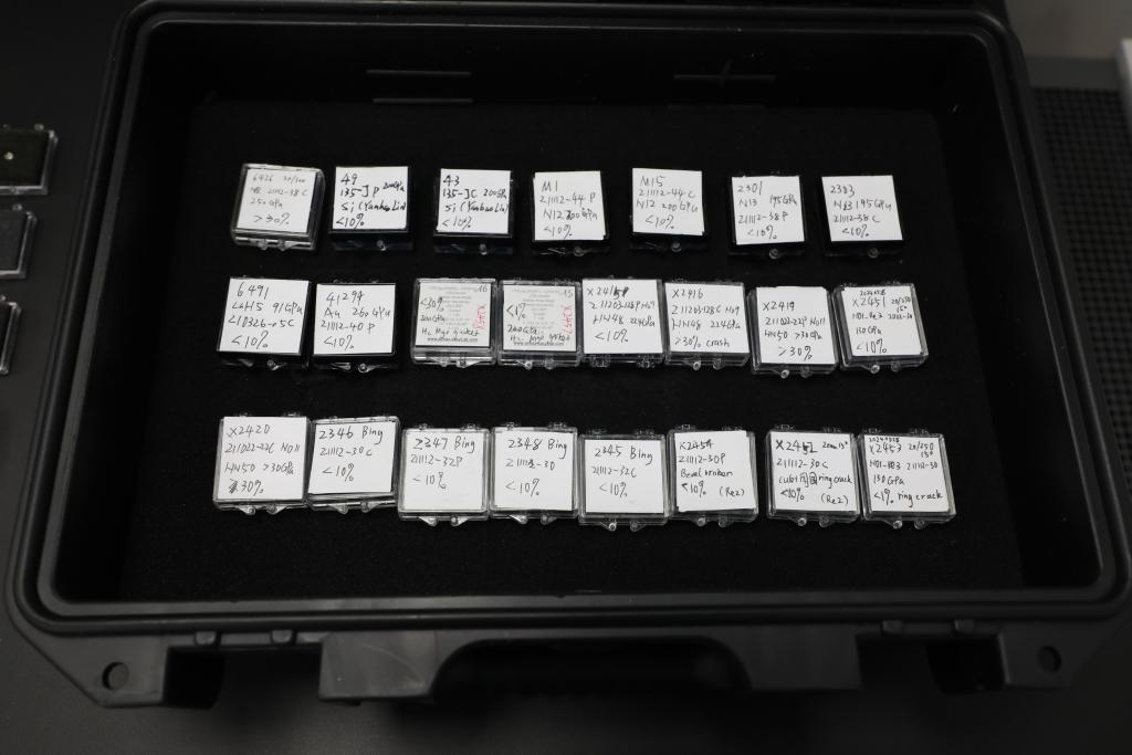 北京高压科学研究中心的实验室里,已完成实验的破碎金刚石样品被编上号、贴上标签,保存起来。图为打开盒盖后已完成实验的部分破碎金刚石样品。(受访者供图)
