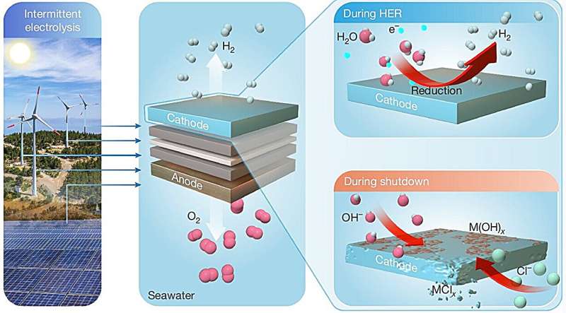 材料科学与工程系刘斌教授解释,研究主要解决间歇性碱性(海)水电解过程中的氧化和性能损失问题,如反向电流、自氧化、自放电或氧气交叉等,通过在电极上使用特殊保护层实现。