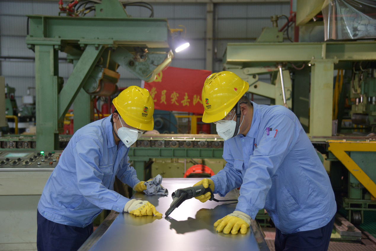 图为:Zr-4项目攻关党员突击队的冷轧操作人员正在修磨带材。 徐华 摄
